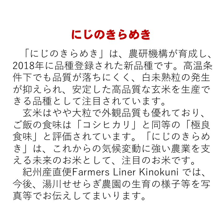 美しい水の郷、有田川町清水地区に流れる湯川川流域で農業を営む湯川せせらぎ農園の2025年産新米の玄米「にじのきらめき」です。