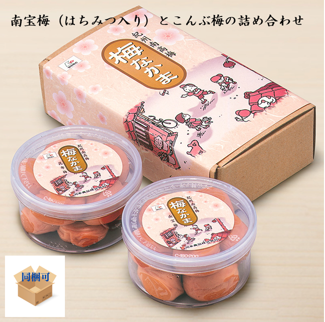 一度に2種類の梅干が楽しめます。はちみつ梅干しの自然な甘さと、こんぶ梅の深い旨味。誰でも楽しめるやさしい味わいをお試しください。また、ちょっとしたお使い物にも最適です。