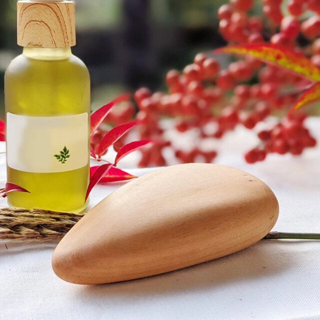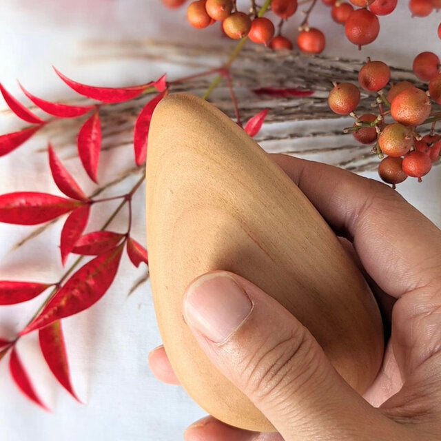 肌を擦り、圧をかけて血液やリンパの流れを良くする美容法「カッサ」のマッサージ道具です。優しく手に馴染むように、山桜を一つずつ手で削り出しています。