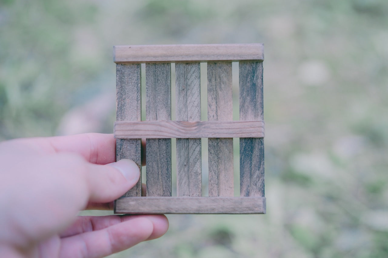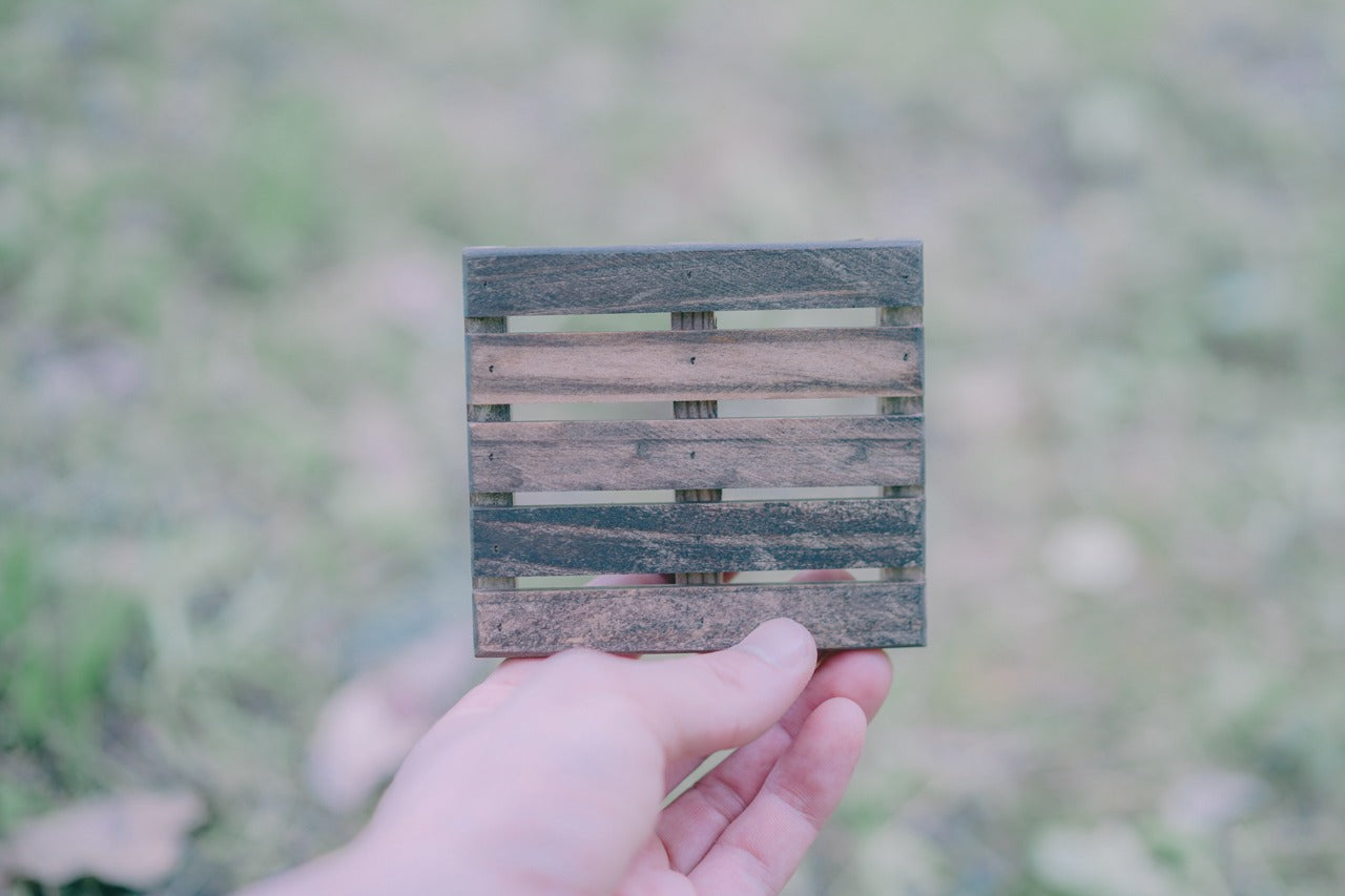 実際のパレット木材を使って、パレット型のコースターとしてアップサイクルしました。